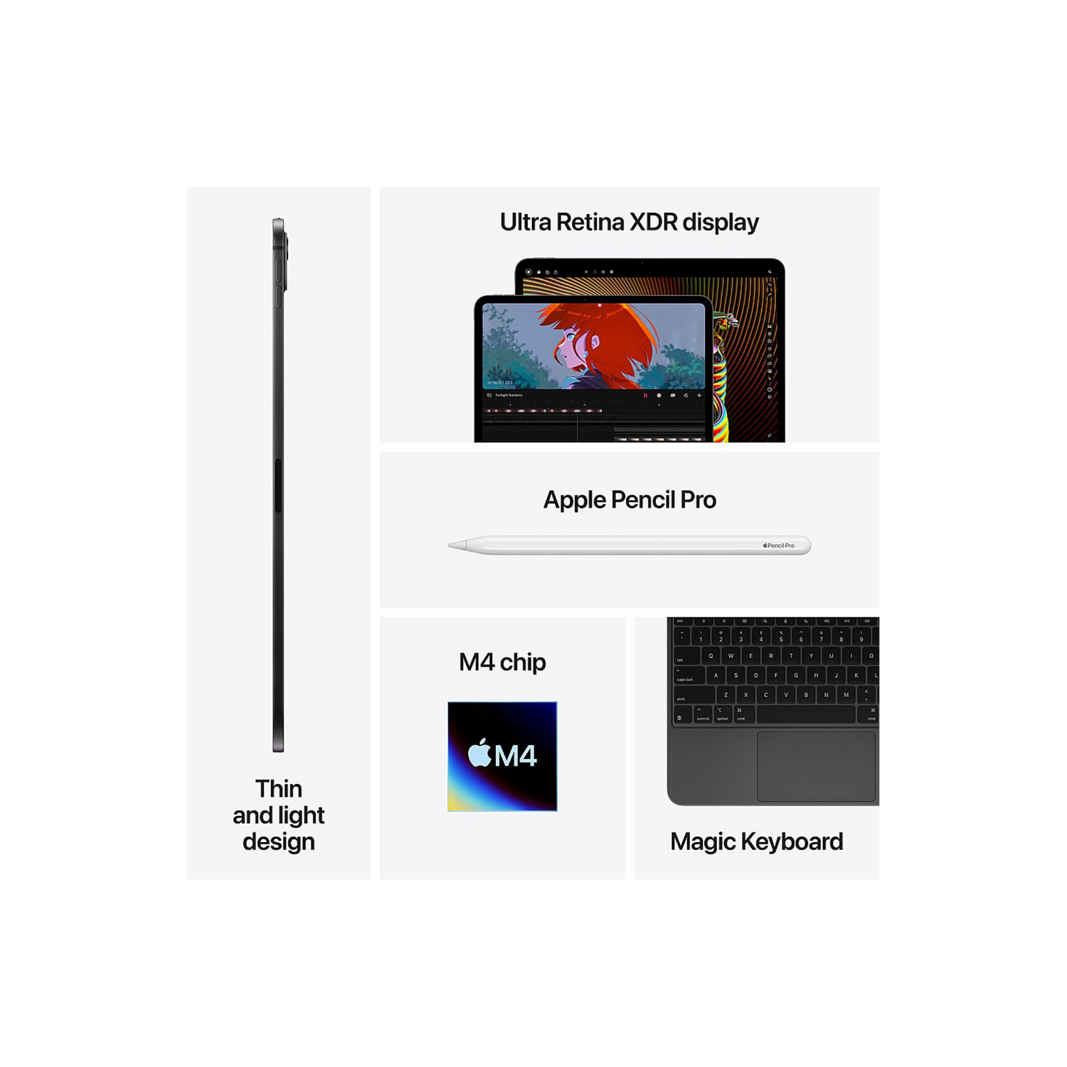 APPLE PENCIL AND MAGIC KEYBOARD FOR IPAD PRO—Apple Pencil Pro transforms iPad Pro into an immersive drawing canvas and the world’s best note‑taking device. Apple Pencil (USB-C) is also compatible with iPad Pro. Magic Keyboard for iPad Pro features a thin and light design, great typing experience, and a built‑in glass trackpad with haptic feedback, while doubling as a protective cover for iPad. Accessories sold separately.