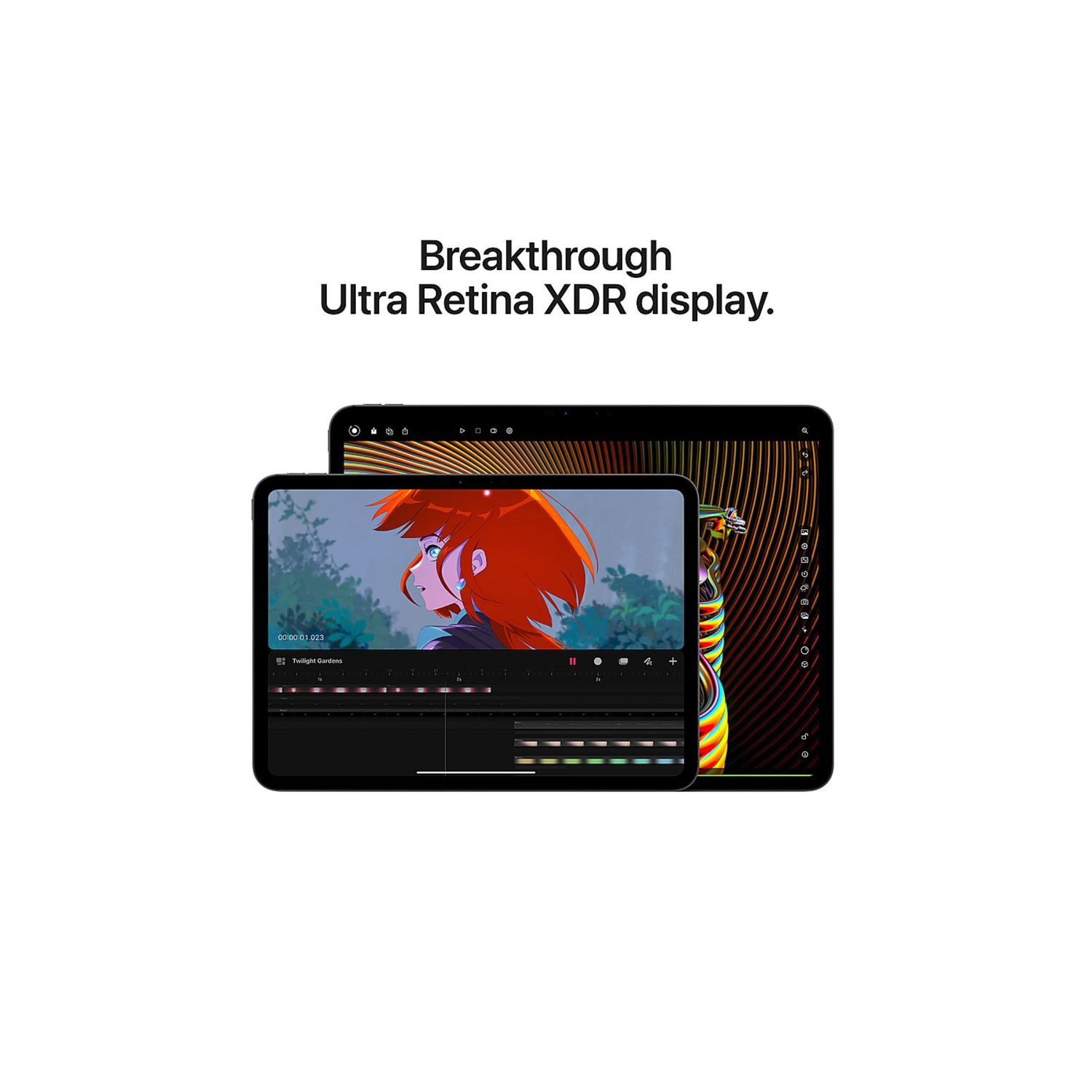 ADVANCED CAMERAS—iPad Pro features a landscape 12MP Ultra Wide front camera that supports Center Stage for videoconferencing or epic Portrait mode selfies. The 12MP Wide back camera with adaptive True Tone flash is great for capturing photos or 4K video with ProRes support. Four studio-quality microphones and a four-speaker audio system provide rich audio. And AR experiences are enhanced with the LiDAR Scanner to capture a depth map of any space.