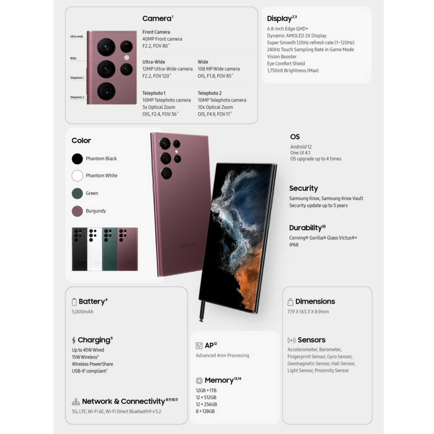 The Samsung Galaxy S22 Ultra is an incredible device. The power of our fastest chip ever, long lasting battery, and sophisticated AI enables revolutionary night-time video that’s as clear-as-day. And, for the first time, S Pen with its increased super-powers has been embedded in Galaxy S22 Ultra’s beautifully sleek design. Today, Galaxy S22 Ultra sets an epic standard of smartphone experience.